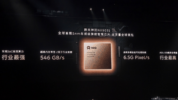 蔚来 ES9 还搭载全球首颗 5nm 车规级旗舰智驾芯片 —— 蔚来神玑 NX9031。据介绍,这款芯片拥有超过 500 亿颗晶体管,采用 32 核心 CPU 架构,内置 LPDDR5x 8533Mbps 速率 RAM,可实现“高动态范围高性能 ISP”,拥有 6.5 G Pixel / s 像素处理能力,处理延时小于 5ms。