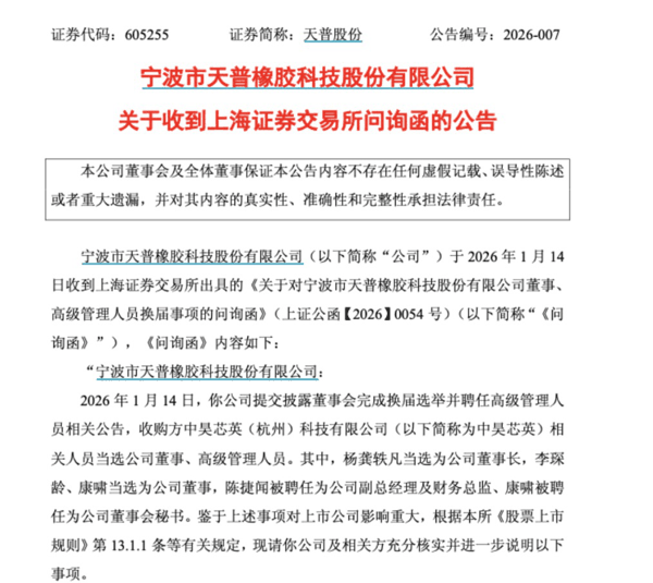 1月14日晚间,刚刚完成董事会换届的 天普股份 披露,公司收到上交所出具的《关于对宁波市天普橡胶科技股份有限公司董事、高级管理人员换届事项的问询函》。