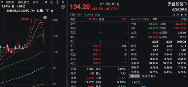 1月14日,在天普股份披露收到问询函及完成董事会换届的公告之前,公司股价在集合竞价阶段便一路走高,开盘后迅速封死涨停板,截至收盘,报194.26元。