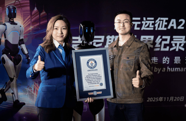 11月20日,记者获悉,智元机器人“远征A2”人形机器人以106.286公里的行走距离,正式摘得吉尼斯“人形机器人行走最远距离”认证。这场从苏州金鸡湖到上海外滩的跨省“长途跋涉”,不仅刷新了行业对双足机器人耐力与可靠性的认知,更标志着人形机器人从实验室走向真实场景的关键突破。