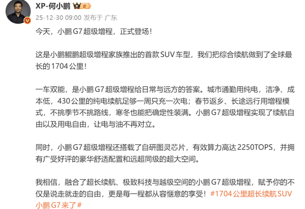 今日,小鹏汽车董事长何小鹏发文宣布,小鹏G7超级增程正式登场。