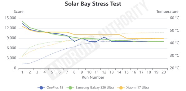 这种图形性能领先优势却转瞬即逝。三星机型在三款设备中升温最快,迅速触发系统降频机制,经过 4 分钟高强度图形渲染,三款手机的性能表现完全回归同一水平线。