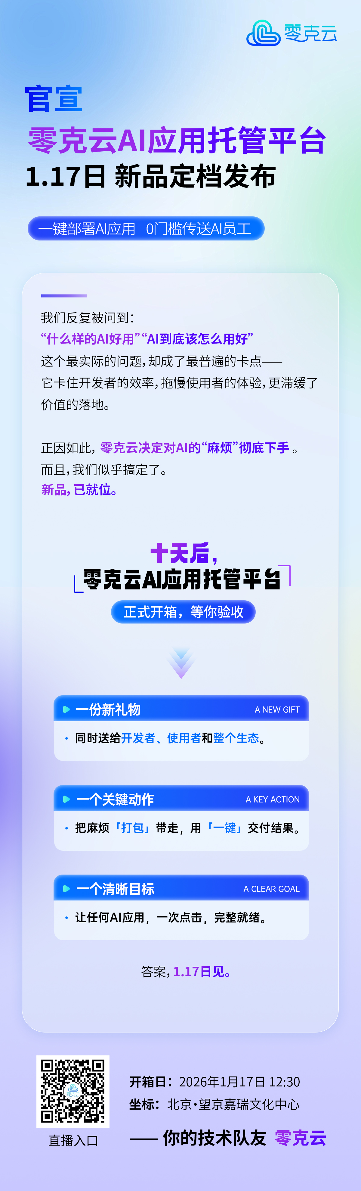 零克云将于1月17日在北京望京嘉瑞文化中心举行新品发布会,主题为“一键部署AI应用,0门槛传送AI员工”。此次发布会旨在展示其AI应用托管平台,该平台旨在简化AI部署过程,降低技术门槛,提高效率。