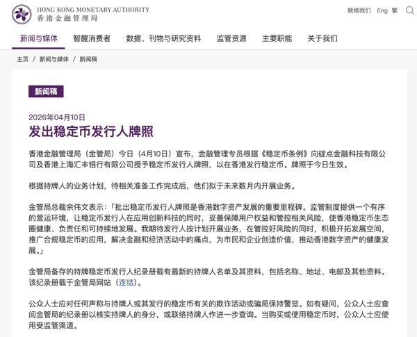 4月10日,香港金融管理局(下称“金管局”)消息显示,首批稳定币发行人牌照已正式发出。碇点金融科技有限公司(由渣打 银行 (香港)、香港电讯及安拟集团联合组建)、香港上海汇丰 银行 有限公司成为首批获牌机构。牌照自当日起生效。这一落地标志着香港稳定币监管制度正式进入落地实施新阶段。