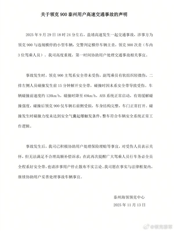 领克900车主称事故后安全带未锁死致母亲九级伤残官方回应