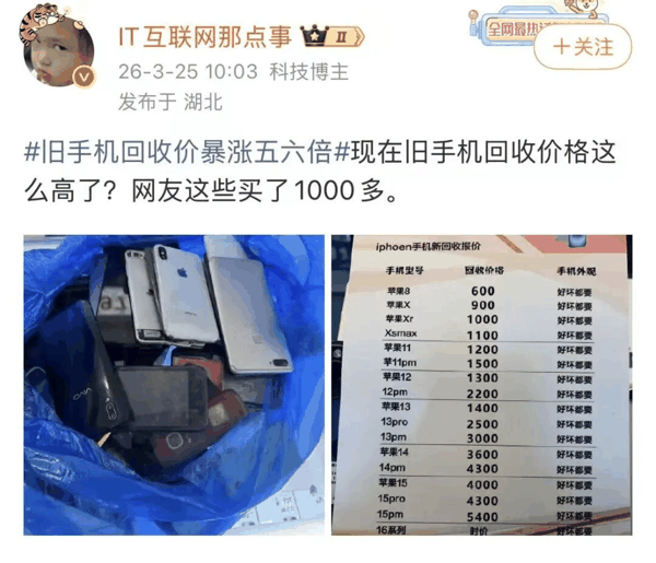 随着存储芯片价格松动,旧手机回收行情也 同步回落。