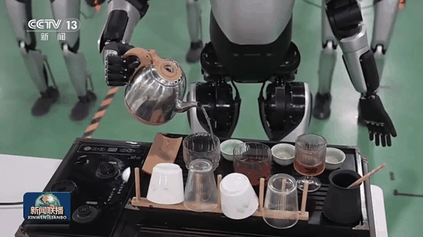 总台央视记者 王世玉: 现在这些机器人正在进行出厂前的最后测试,那这台机器人正在练习泡茶。我们看到机器人能精准地找到茶杯的位置,茶水量也是不多不少刚刚好。