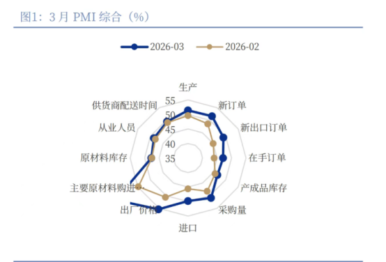 3月PMI显示国内经济在一季度末有明显修复,制造业供需两端同步改善,其中需求修复的斜率甚至快于生产端,是本月数据最大的积极信号,新订单指数23个月来首次高于生产指数。从结构上看,修复主要由高技术制造、装备制造、消费品以及有色等中上游行业带动,背后既有出口韧性支撑,也有“两新”政策延续、基建和地产投资边际修复的推动。与此同时,价格指标大幅上行,中东局势正在通过油价上升传导至化工品和其他中游产品,迫使出厂价格跟随式上涨。库存端则显示企业行为仍偏谨慎,采购有所恢复,但原材料库存和产成品库存修复幅度有限。