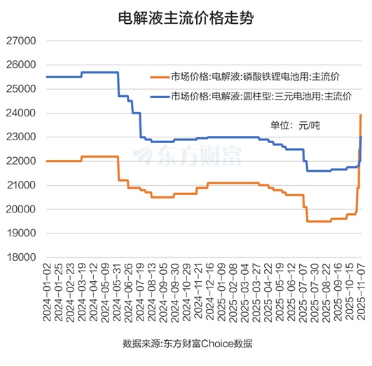 从近期的市场数据来看,电解液、六氟磷酸锂正经历明显的价格上涨。隆众资讯的数据显示,11月7日磷酸铁 锂电池 用电解液的价格为2.39万元/吨,和7月中下旬、8月份的1.95万元/吨相比,大幅上涨22.56%。圆柱形三元 电池 用电解液的价格为2.3万元/吨,和7月中下旬、8月份的2.16万元/吨相比,价格上涨6.48%。