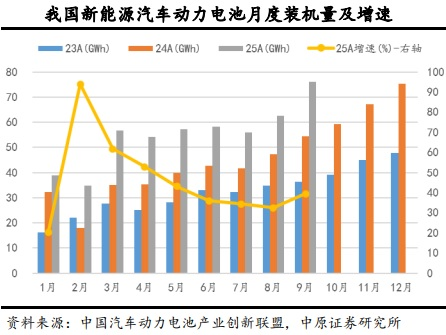 动力电池而言, 中原证券 表示,2025年9月,我 国新能源 汽车动力电池装机量76GWh,同比增长39.45%,环比增长21.6%。今年前9月,我 国新能源 汽车动力电池累计装机494.1GWh,同比增长42.52%。