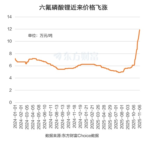 电解液价格的增长也带动了核心材料六氟磷酸锂的价格上涨。 东方财富 Choice数据显示,六氟磷酸锂11月6日的报价为11.9万元/吨,这较今年7月中下旬的4.93万元/吨大涨141.38%。