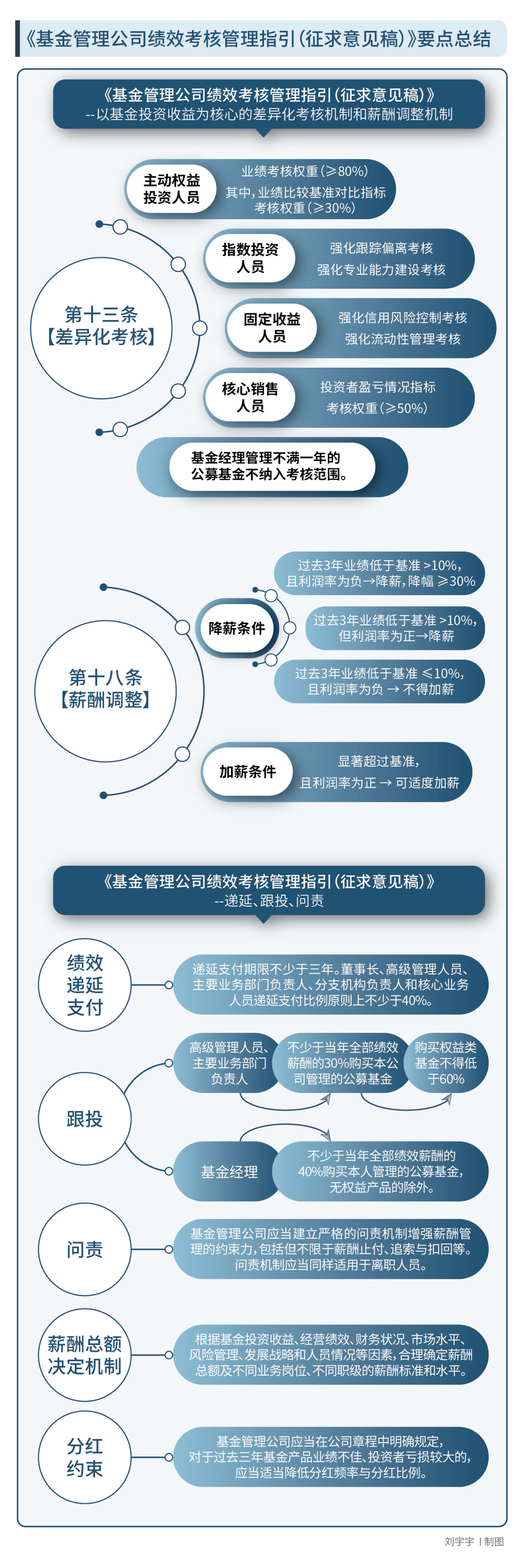 南方周末新金融研究中心将《指引》核心内容逐条拆解梳理,提炼出七大要点并制图呈现 (详见下图) 。其中,针对主动权益类基金经理的阶梯化薪酬调整规则(《指引》第十八条,具体内容详见同图)因直接绑定基金经理收入,成为市场关注焦点。