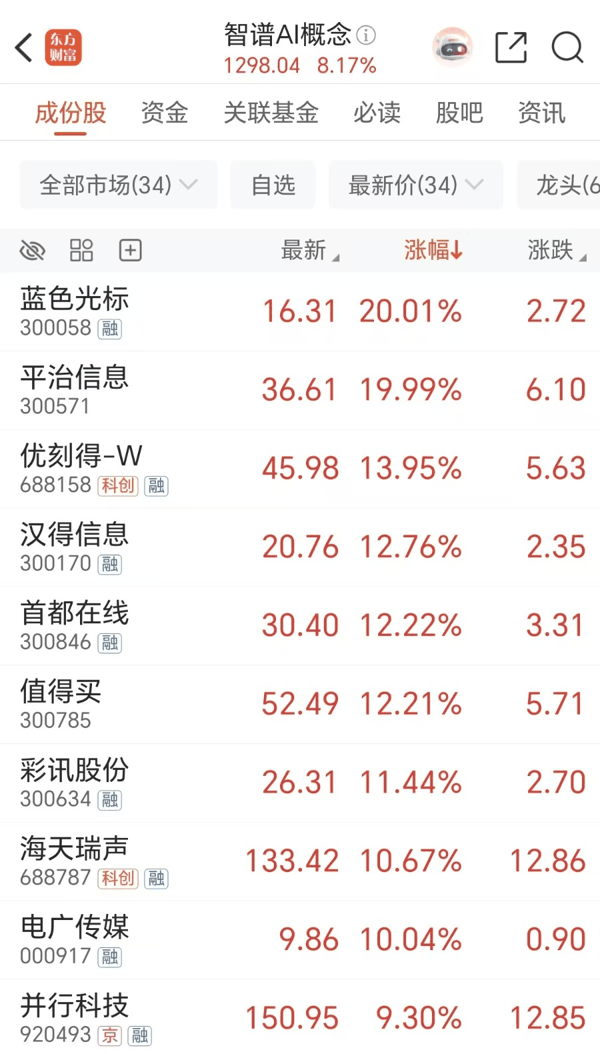 周三 智谱 AI概念大涨超8%, 蓝色光标 、 平治信息 20CM涨停,优刻得、 汉得信息 、 首都在线 等涨超10%。