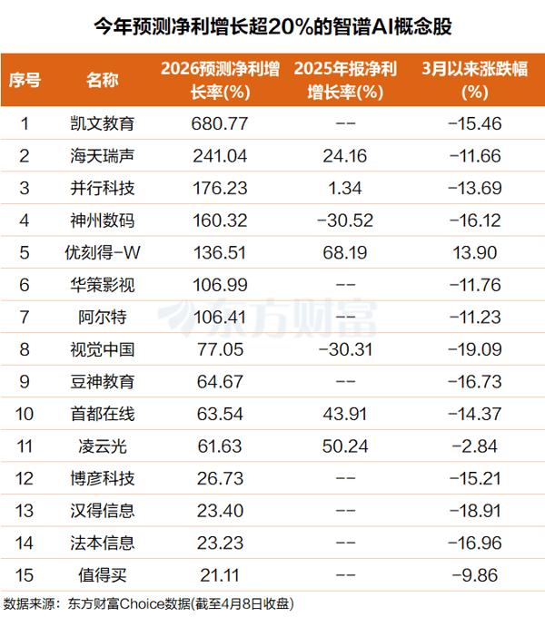 东方财富 Choice数据显示,按照机构一致预测2026年净利润增长率数据, 智谱AI概念 股中,有15只个股,预计2026年净利润增长率超20%。
