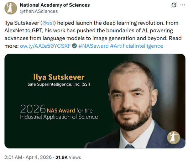 刚刚,Ilya Sutskever获得美国国家科学院大奖,AI领域首次