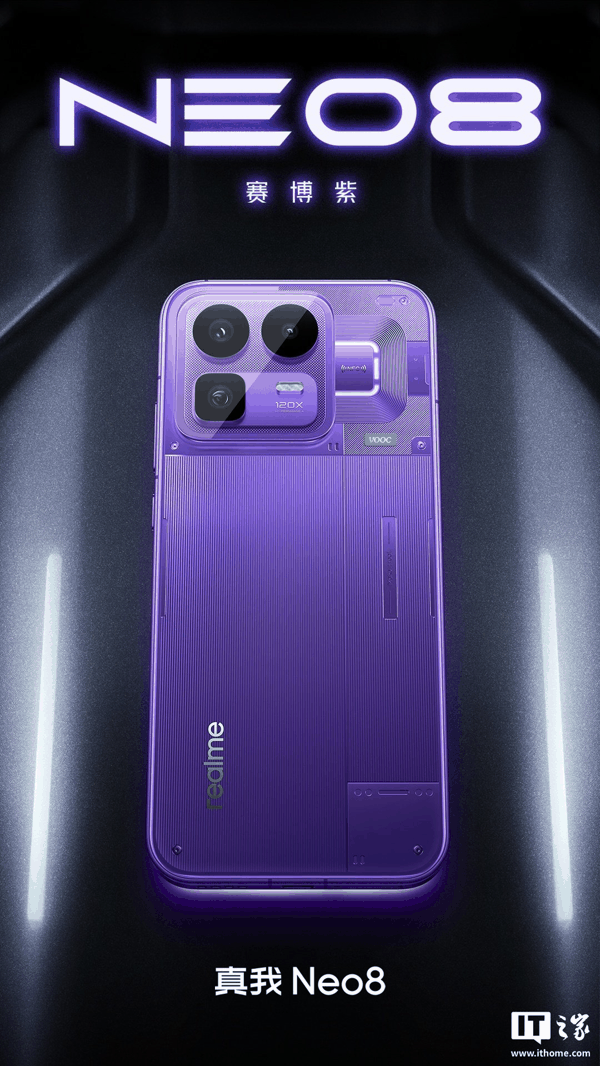 新机定位“开年越级大作”,已官宣“本月见”。真我 Neo8 的「赛博紫」配色已经公布,新机采用透明 RGB 设计,同时标志性的觉醒光环元素在该机回归。