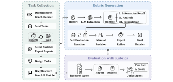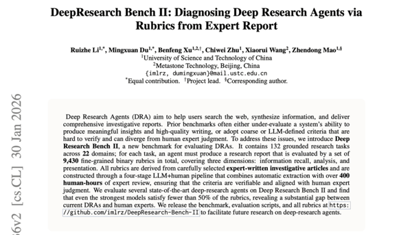 来自中国科学技术大学的研究团队围绕这一问题展开了系列工作,先后推出了 DeepResearch Bench 和 DeepResearch Bench II 两代评估基准。所有数据、代码和评估脚本均已开源: