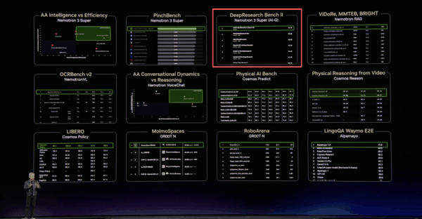 3 月 16 日,在刚刚结束的 NVIDIA GTC 2026 大会上,黄仁勋在长达三小时的 Keynote 演讲中发布了 NVIDIA Agent Toolkit 和 AI-Q 开放智能体蓝图,将 AI Agent 定位为下一个重大前沿。引人注目的是,NVIDIA 在展示 AI-Q 的深度研究能力时,选择了 DeepResearch Bench 和 DeepResearch Bench II 作为评测标准 ——AI-Q 在两个榜单上均登顶第一,分别取得 55.95 和 54.50 的成绩。
