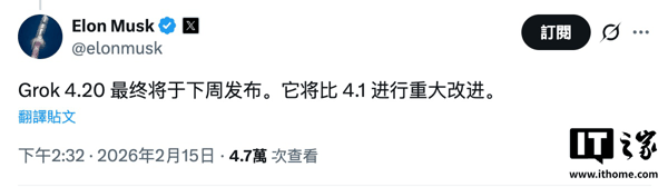 IT之家 2 月 15 日消息,xAI CEO 埃隆 · 马斯克今天在 X 平台表示,Grok 4.20 将在下周发布,相比 4.1 版改进重大。