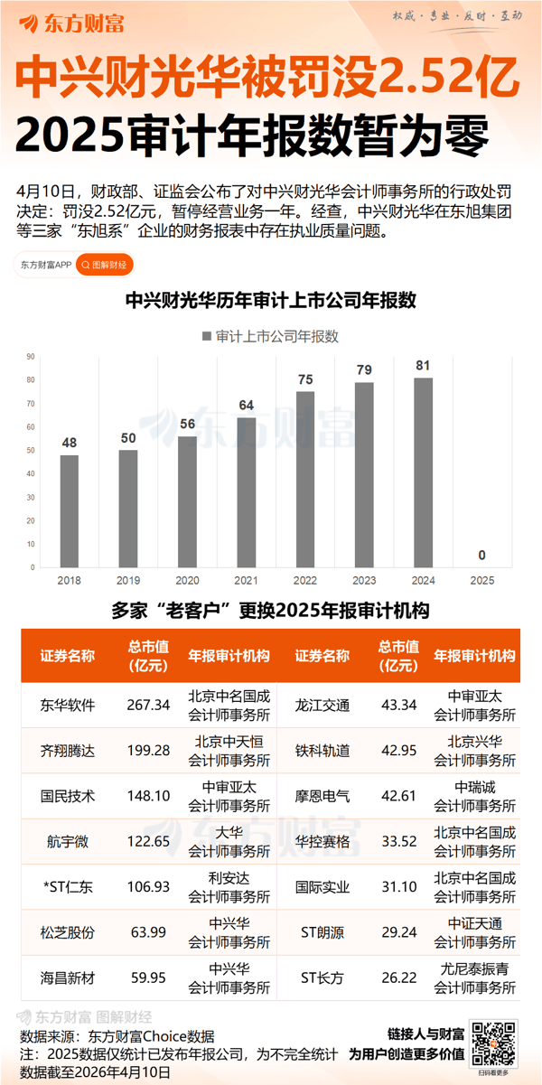 从该行政处罚决定内容看,自2025年6月起,财政部组织检查组对中兴财光华开展了执业质量检查,并延伸检查了相关企业。经查,中兴财光华在多个审计项目中存在执业质量问题,其中包含涉及东旭集团有限公司、东旭光电科技股份有限公司、东旭蓝天 新能源 股份有限公司等三家“东旭系”企业的财务报表审计问题。上述三家企业曾因财务造假、欺诈发行等违法行为受到证券监督管理部门重罚。