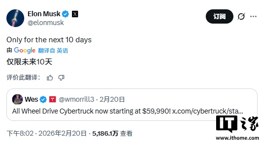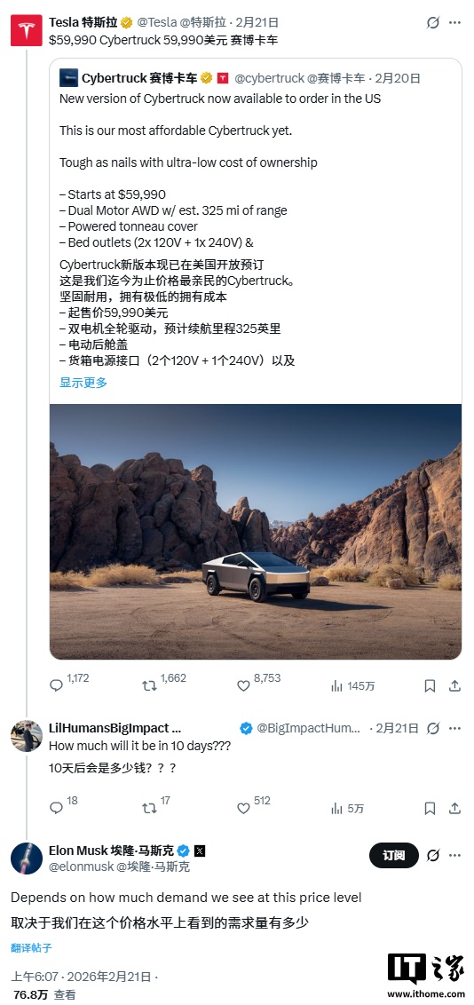 IT之家 2 月 22 日消息,在于 X 平台发布一则含糊其辞的帖子中,埃隆 · 马斯克暗示特斯拉可能取消或调整其新款全轮驱动版 Cybertruck 的定价后,这位 CEO 现已对其意图作出明确解释。这番最新表态揭示了特斯拉对这款备受瞩目的电动皮卡新配置的真实市场策略,并立即在粉丝群体中引发了截然不同的反响。