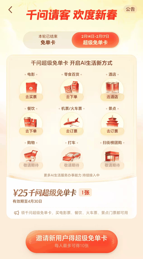 千问APP还显示, 新用户打开千问APP 后,可 直接获得一张25元超级免单卡 ; 所有人每邀请一名 “ 千问新人 ” 双方可各得一张超级免单卡 , 最多可得10张。此次免单卡需在2月17日前集完。