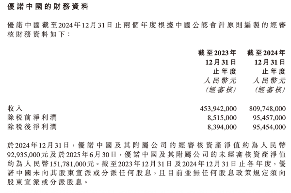 在2023年,优诺中国营收为4.54亿元,税后净利润为851.5万元。到了2024年,优诺中国营收就已增至8.1亿元,税后净利润9545.4万元。
