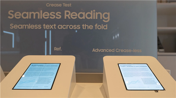 为了更直观的展示无折痕面板的优势,三星专门设立了一个折痕展示区,将新款折叠OLED面板(右)与现有OLED面板(左)摆放在一起。