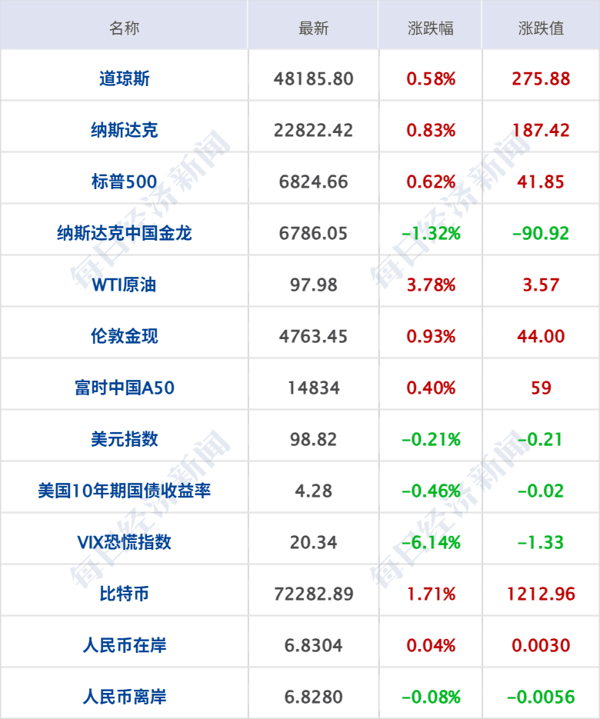 美股三大指数收盘集体收涨,纳指涨0.83%,标普500指数涨0.62%,道指涨0.58%,其中,纳指、标普500指数录得七连涨 ;科技股普涨, 闪迪 涨超9%, 亚马逊 涨超5%, 英特尔 涨超4%, 美光科技 、 应用材料 涨超3%, 奈飞 、Meta、AMD涨超2%。中概股多数下跌, 纳斯达克 中国金龙指数跌1.32%, 蔚来 、 百度 集团跌超4%, 好未来 跌逾3%, 阿里巴巴 、 金山云 涨逾1%, 京东 集团涨逾1%。
