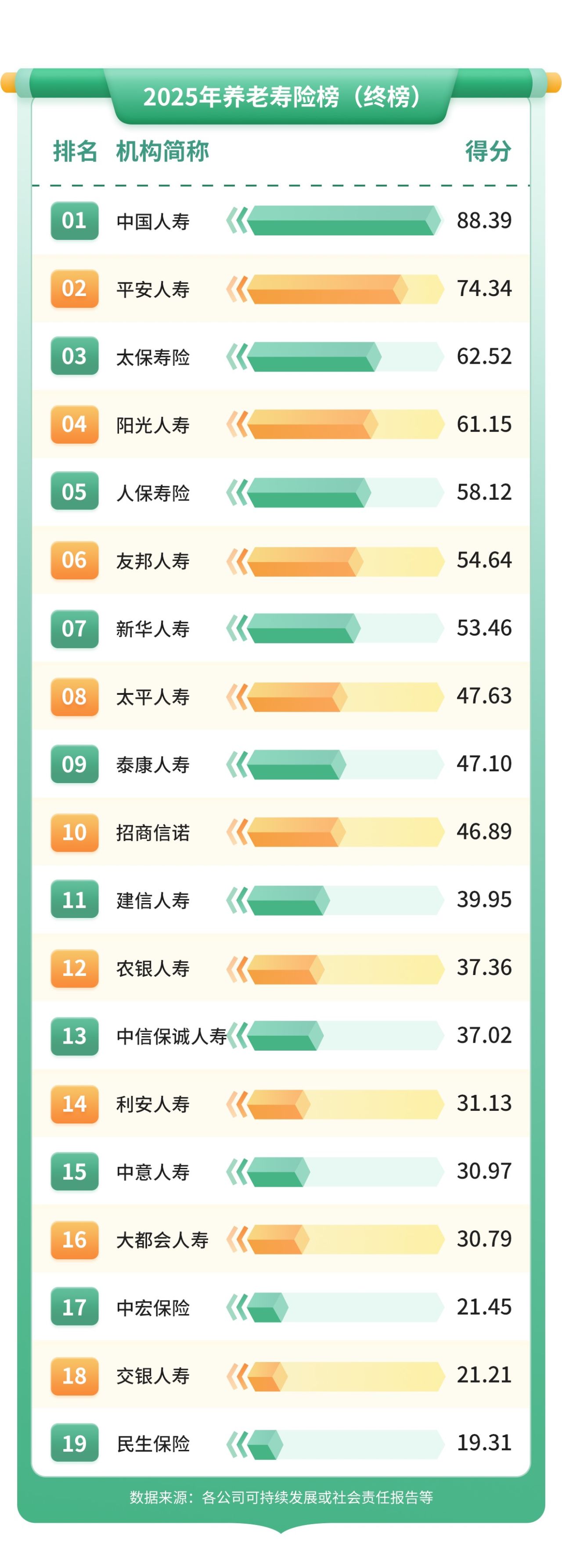 养老寿险榜终榜显示,21家寿险公司得分呈梯次分布,仅四家机构得分超过60分。榜首中国人寿与榜尾安联人寿分差接近77分。中国人寿也是唯一得分超过80分的机构。