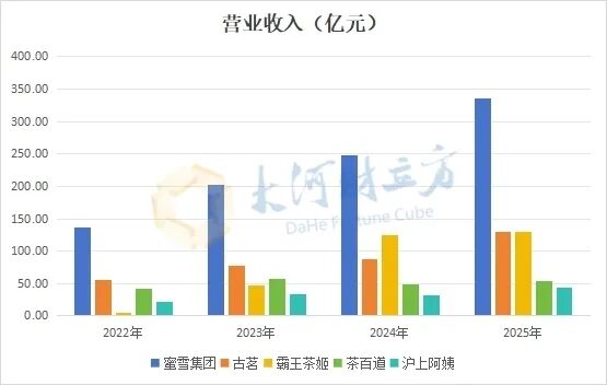 从营收规模来看,2025年 蜜雪集团 以335.60亿元稳居行业第一,同比增长35.2%,规模与增速双双领先。 古茗 与 霸王茶姬 营收规模相近,分别为129.14亿元和129.07亿元,但 古茗 以46.9%的增速位居五家企业之首, 霸王茶姬 同比增长4.05%,增速放缓。 茶百道 与 沪上阿姨 位列第三梯队,营收分别为53.95亿元和44.66亿元,增速分别为9.7%和35.96%。