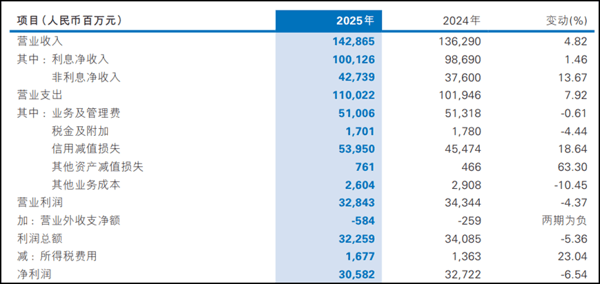 公司财报披露,2025年, 民生银行 实现营业收入1428.65亿元,同比增长4.82%;归属于本行股东的净利润305.63亿元,同比下降5.37%;扣除非经常性损益后的净利润309.26亿元,同比下降4.19%。其中 民生银行 业绩的最大亮点在于营收增速转正,扭转了此前营收连续下滑的颓势。