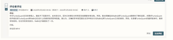 值得注意的是,TurboQuant论文作者在ICLR OpenReview(学术圈常用的公开论文评审平台)的审稿回复中,这样描述自己的方法:“我们的实现方式是,先用向量的 L2 范数对其进行归一化,然后施加一次随机旋转,以确保这些向量在旋转后的各个分量服从 Beta 分布。”这与 RaBitQ 的核心机制高度吻合, 但在论文正文中却从未正面说明这一联系。