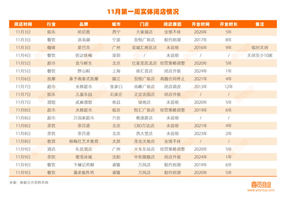 据壹览商业不完全统计,11月第一周,共16个品牌关闭了至少28家门店。