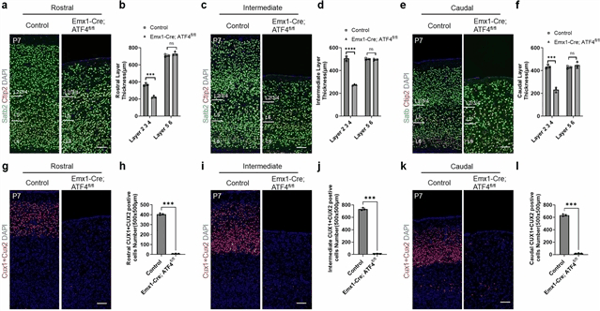 本研究表明,激活转录因子4(ATF4)在DNA损伤反应中起关键调节作用,可直接激活双链DNA修复组分,包括CIRBP、UBA52和EBF1。值得注意的是,泛皮质敲除(Emx1-Cre;Atf4fl/fl)表明,ATF4是上层2/3神经元发育所特异性需要的,其标志是剪切样同源盒2蛋白CUX2的表达。ATF4以p53依赖的方式修复DNA损伤和减轻胚胎放射状胶质祖细胞的细胞死亡。特别是,该课题组发现冷诱导RNA结合蛋白(CIRBP)是ATF4的转录靶点,ATF4是关键双链DNA修复因子共济失调毛细血管扩张突变(ATM)正常磷酸化所必需的。这些发现表明ATF4是DNA损伤反应的重要调节因子。他们进一步表明,在哺乳动物大脑发育过程中,CUX2 + 神经元在复制应激后对DNA修复有特殊的需求。