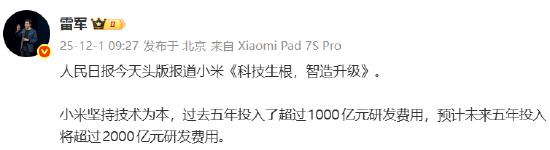 12月1日,小米公司创始人、董事长、首席执行官雷军微博发文称,人民日报今天头版报道小米《科技生根,智造升级》,并表示,小米坚持技术为本,过去五年投入了超过1000亿元研发费用,预计未来五年投入将超过2000亿元研发费用。
