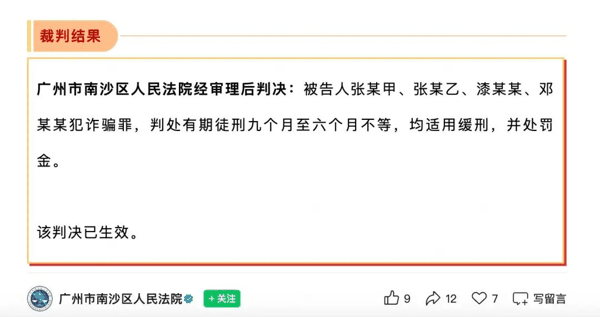 在检测到相关异常后,滴滴第一时间联动广州警方成立专案组,根据双方线索开展调查取证工作,并成功抓获犯罪嫌疑人,推动案件进入司法程序。经过法院审理后判决, 被告人张某甲、张某乙、漆某某、邓某某犯诈骗罪,判处有期徒刑 9 个月至 6 个月不等,均适用缓刑,并处罚金 。