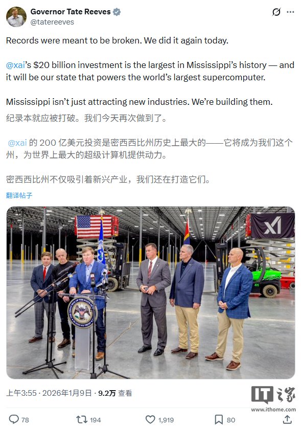 IT之家 1 月 9 日消息,密西西比州州长泰特・里夫斯今日宣布,马斯克旗下 AI 初创公司 xAI 将向该州投资超 200 亿美元(IT之家注:现汇率约合 1399.22 亿元人民币)建设 AI 数据中心,这标志着该州历史上规模最大的单一经济发展项目正式落地。