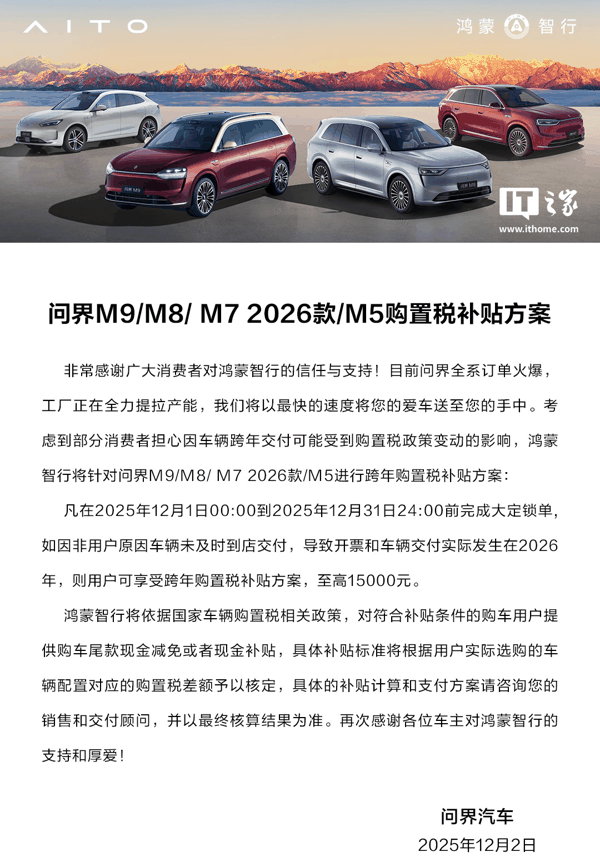 IT之家注意到,鸿蒙智行今日官宣了问界 M9 / M8 / M7 2026 款 / M5 购置税补贴方案,考虑到部分消费者担心因车辆跨年交付可能受到购置税政策变动的影响,鸿蒙智行将针对问界 M9 / M8 / M7 2026 款 / M5 进行跨年购置税补贴。