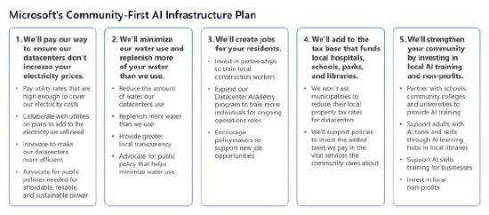昨天,微软总裁布拉德·史密斯(Brad Smith)正式发布了名为“社区优先AI基础设施”的计划,提出在兴建数据中心时拒绝电力补贴,减少用水,不要退税,解决就业,反馈社区等五点承诺。该计划旨在让微软成为社区的“好邻居”,确保AI基础设施发展带来的益处大于成本,并惠及当地居民。