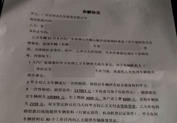 北汽电动车三包期内在地库起火自燃车主获赔11万多