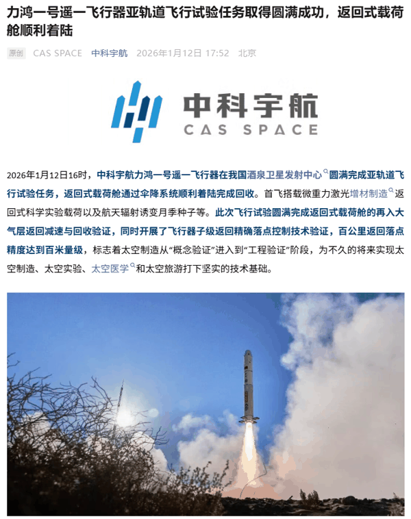 IT之家 1 月 12 日消息,今日 16 时,中科宇航力鸿一号遥一飞行器在我国 酒泉卫星发射中心 圆满完成亚轨道飞行试验任务,返回式载荷舱通过伞降系统顺利着陆完成回收。