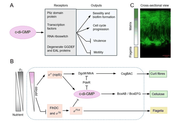 图1. 大肠杆菌菌落生物膜形成中全局调控机制的示意图