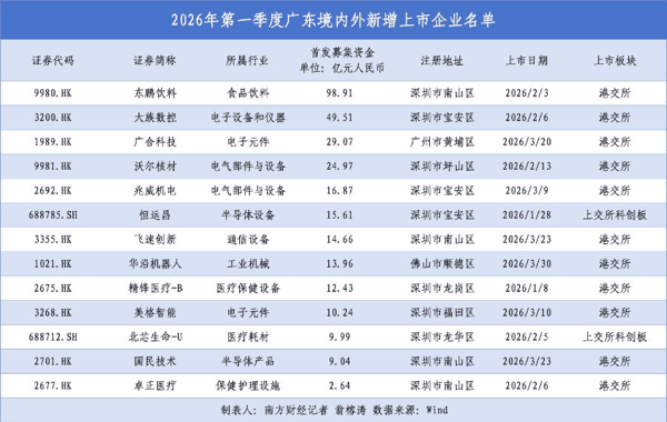 区域分布上,深圳继续发挥广东资本市场“领头羊”作用,一季度13家新增上市企业中,有11家注册地位于深圳,覆盖 半导体 、医疗健康、 电子 设备等多个赛道,无论是上市数量还是募资规模均稳居全省第一。