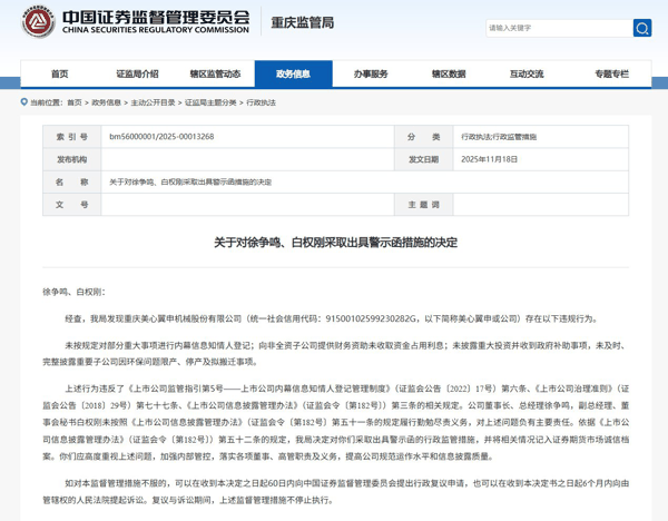 依据《上市公司信息披露管理办法》(证监会令〔第182号〕)第五十二条的规定,重庆证监局决定对徐争鸣、白权刚采取出具警示函的行政监管措施,并将相关情况记入证券期货市场诚信档案。