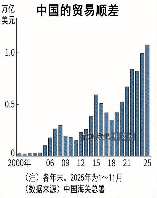 海关总署8日公布的数据显示,2025年前11个月,我国贸易顺差达到1.08万亿美元。据《纽约时报》报道,这是中国贸易顺差在历史上首次超过1万亿美元。《华尔街日报》则认为,这一“里程碑式”的数据,凸显出中国占据了“从T恤衫到高端电动车”等各个产业领域的主导地位。