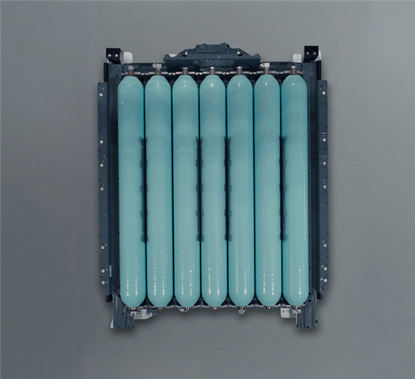 这套存储系统的核心由七个高压碳纤维复合材料储氢罐组成,它们以并联方式紧凑地集成在一个坚固的金属框架之中。