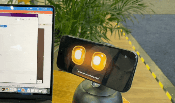 基站会自动激活预装的 APP,在屏幕上实时显示一双眼睛,手机+ Loona DeskMate 就变成了一个小型的 AI 机器人。