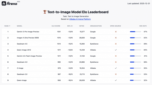 不止于能力增强,模型整体表现也实现突破:在 AI Arena 超过 1 万局的用户盲测 中,数据显示 Qwen-Image-2512 在开源模型中表现最优,并在与多款闭源模型的对比中依然展现出显著竞争力。