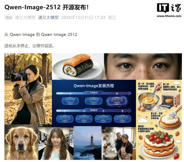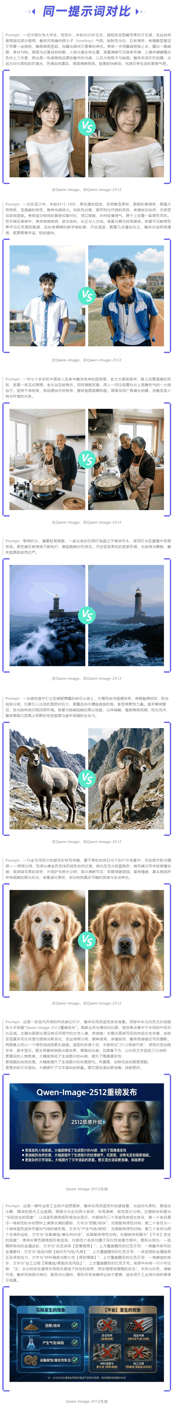 IT之家 12 月 31 日消息,阿里通义大模型今日开源发布 Qwen-Image-2512,聚焦于三大核心能力的飞跃式提升: 更真实的人物质感、更细腻的自然纹理、更复杂的文字渲染 ,让生成的图像无限接近真实世界。